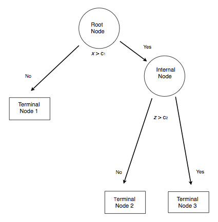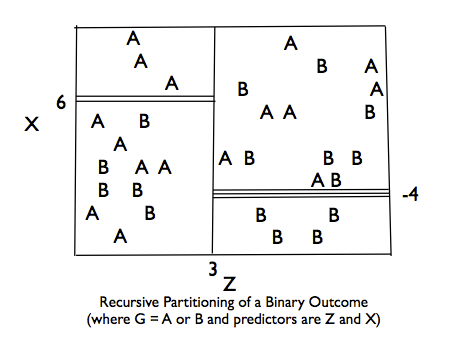 class: center, middle, inverse, title-slide # Classification and Regression Trees ## ### Jason Bryer, Ph.D. ### 2024-11-04 --- # Classification and Regression Trees The goal of CART methods is to find best predictor in X of some outcome, y. CART methods do this recursively using the following procedures: * Find the best predictor in X for y. * Split the data into two based upon that predictor. * Repeat 1 and 2 with the split data sets until a stopping criteria has been reached. There are a number of possible stopping criteria including: Only one data point remains. * All data points have the same outcome value. * No predictor can be found that sufficiently splits the data. --- # Recursive Partitioning Logic of CART .pull-left[ Consider the scatter plot to the right with the following characteristics: * Binary outcome, G, coded “A” or “B”. * Two predictors, x and z * The vertical line at z = 3 creates the first partition. * The double horizontal line at x = -4 creates the second partition. * The triple horizontal line at x = 6 creates the third partition. ] .pull-right[  ] --- # Tree Structure .pull-left[ * The root node contains the full data set. * The data are split into two mutually exclusive pieces. Cases where x > ci go to the right, cases where x <= ci go to the left. * Those that go to the left reach a terminal node. * Those on the right are split into two mutually exclusive pieces. Cases where z > c2 go to the right and terminal node 3; cases where z <= c2 go to the left and terminal node 2. ] .pull-right[  ] --- # Sum of Squared Errors The sum of squared errors for a tree *T* is: `$$S=\sum _{ c\in leaves(T) }^{ }{ \sum _{ i\in c }^{ }{ { (y-{ m }_{ c }) }^{ 2 } } }$$` Where, `\({ m }_{ c }=\frac { 1 }{ n } \sum _{ i\in c }^{ }{ { y }_{ i } }\)`, the prediction for leaf \textit{c}. Or, alternatively written as: `$$S=\sum _{ c\in leaves(T) }^{ }{ { n }_{ c }{ V }_{ c } }$$` Where `\(V_{c}\)` is the within-leave variance of leaf \textit{c}. Our goal then is to find splits that minimize S. --- # Advantages of CART Methods * Making predictions is fast. * It is easy to understand what variables are important in making predictions. * Trees can be grown with data containing missingness. For rows where we cannot reach a leaf node, we can still make a prediction by averaging the leaves in the sub-tree we do reach. * The resulting model will inherently include interaction effects. There are many reliable algorithms available. --- # Regression Trees In this example we will predict the median California house price from the house’s longitude and latitude. ``` r str(calif) ``` ``` ## 'data.frame': 20640 obs. of 10 variables: ## $ MedianHouseValue: num 452600 358500 352100 341300 342200 ... ## $ MedianIncome : num 8.33 8.3 7.26 5.64 3.85 ... ## $ MedianHouseAge : num 41 21 52 52 52 52 52 52 42 52 ... ## $ TotalRooms : num 880 7099 1467 1274 1627 ... ## $ TotalBedrooms : num 129 1106 190 235 280 ... ## $ Population : num 322 2401 496 558 565 ... ## $ Households : num 126 1138 177 219 259 ... ## $ Latitude : num 37.9 37.9 37.9 37.9 37.9 ... ## $ Longitude : num -122 -122 -122 -122 -122 ... ## $ cut.prices : Factor w/ 4 levels "[1.5e+04,1.2e+05]",..: 4 4 4 4 4 4 4 3 3 3 ... ``` --- # Tree 1 ``` r treefit <- tree(log(MedianHouseValue) ~ Longitude + Latitude, data=calif) plot(treefit); text(treefit, cex=0.75) ``` <img src="CART-Methods_files/figure-html/unnamed-chunk-2-1.png" style="display: block; margin: auto;" /> --- # Tree 1 <img src="CART-Methods_files/figure-html/unnamed-chunk-3-1.png" style="display: block; margin: auto;" /> --- # Tree 1 ``` r summary(treefit) ``` ``` ## ## Regression tree: ## tree(formula = log(MedianHouseValue) ~ Longitude + Latitude, ## data = calif) ## Number of terminal nodes: 12 ## Residual mean deviance: 0.1662 = 3429 / 20630 ## Distribution of residuals: ## Min. 1st Qu. Median Mean 3rd Qu. Max. ## -2.75900 -0.26080 -0.01359 0.00000 0.26310 1.84100 ``` Here “deviance” is the mean squared error, or root-mean-square error of `\(\sqrt{.166} = 0.41\)`. --- # Tree 2, Reduce Minimum Deviance We can increase the fit but changing the stopping criteria with the mindev parameter. ``` r treefit2 <- tree(log(MedianHouseValue) ~ Longitude + Latitude, data=calif, mindev=.001) summary(treefit2) ``` ``` ## ## Regression tree: ## tree(formula = log(MedianHouseValue) ~ Longitude + Latitude, ## data = calif, mindev = 0.001) ## Number of terminal nodes: 68 ## Residual mean deviance: 0.1052 = 2164 / 20570 ## Distribution of residuals: ## Min. 1st Qu. Median Mean 3rd Qu. Max. ## -2.94700 -0.19790 -0.01872 0.00000 0.19970 1.60600 ``` With the larger tree we now have a root-mean-square error of 0.32. --- # Tree 2, Reduce Minimum Deviance <img src="CART-Methods_files/figure-html/unnamed-chunk-6-1.png" style="display: block; margin: auto;" /> --- # Tree 3, Include All Variables However, we can get a better fitting model by including the other variables. ``` r treefit3 <- tree(log(MedianHouseValue) ~ ., data=calif) summary(treefit3) ``` ``` ## ## Regression tree: ## tree(formula = log(MedianHouseValue) ~ ., data = calif) ## Variables actually used in tree construction: ## [1] "cut.prices" ## Number of terminal nodes: 4 ## Residual mean deviance: 0.03608 = 744.5 / 20640 ## Distribution of residuals: ## Min. 1st Qu. Median Mean 3rd Qu. Max. ## -1.718000 -0.127300 0.009245 0.000000 0.130000 0.358600 ``` With all the available variables, the root-mean-square error is 0.11. --- # Classification Trees * `pclass`: Passenger class (1 = 1st; 2 = 2nd; 3 = 3rd) * `survival`: A Boolean indicating whether the passenger survived or not (0 = No; 1 = Yes); this is our target * `name`: A field rich in information as it contains title and family names * `sex`: male/female * `age`: Age, a significant portion of values are missing * `sibsp`: Number of siblings/spouses aboard * `parch`: Number of parents/children aboard * `ticket`: Ticket number. * `fare`: Passenger fare (British Pound). * `cabin`: Do